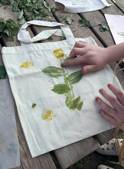 Armed with paper bags, the children set off to explore Little Acorns, collecting a variety of leaves to test. Once gathered, they experimented together, discovering which leaves and flowers created the strongest prints. Some of the older holiday club children even used their new skills to design and print their own tote bags to take home.